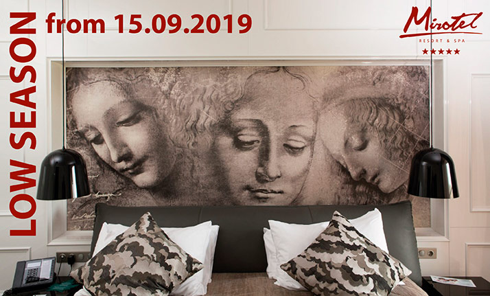 З 15 вересня Mirotel дарує приємні ціни, відчуття тепла і затишку в золоту осінню пору. Це прекрасна пропозиція для тих, хто збирається в найближчому майбутньому відпочити в 5*готелі, поринути у світ розкоші і вишуканості, насолодитися високим рівнем комфорту!