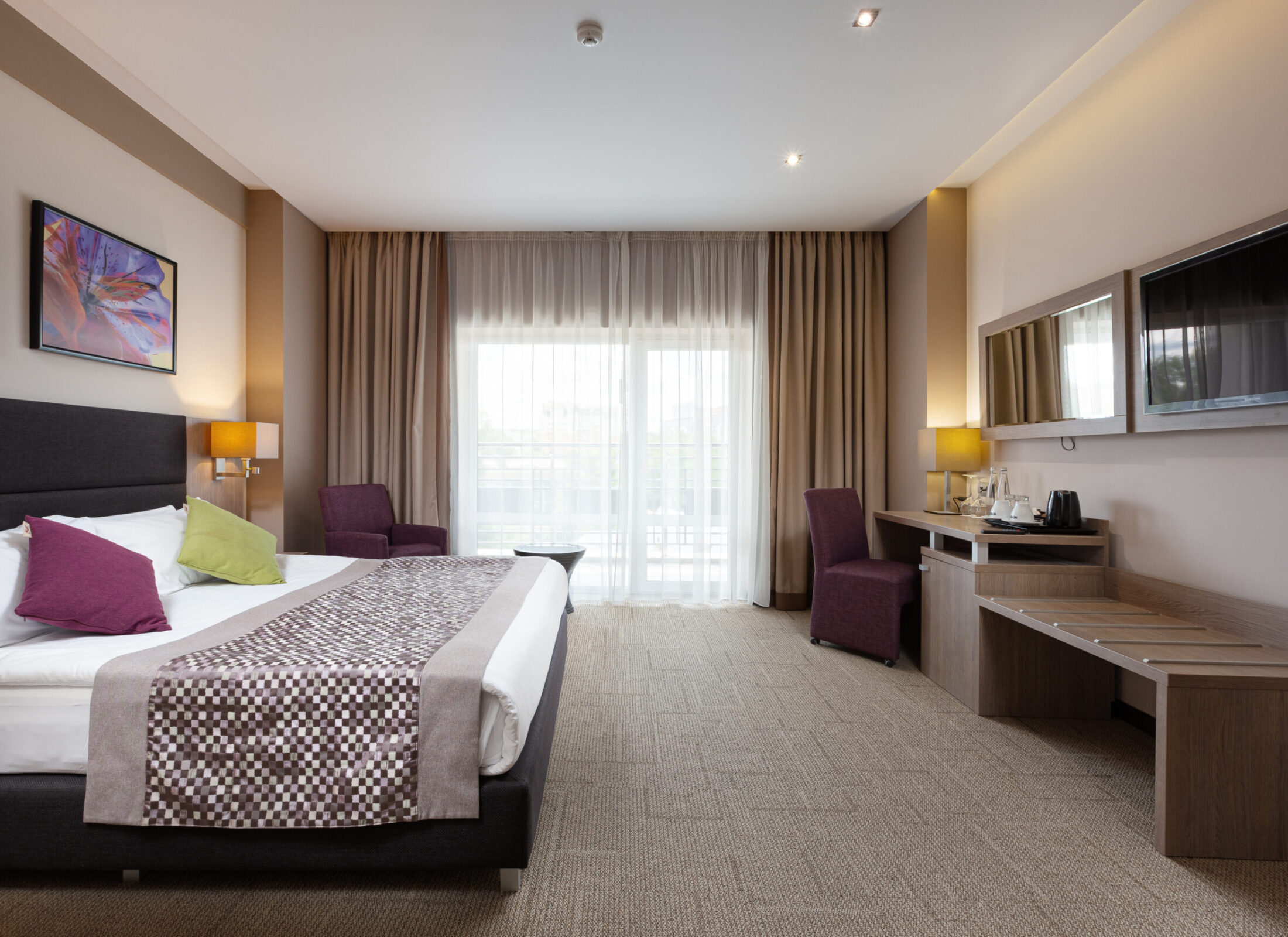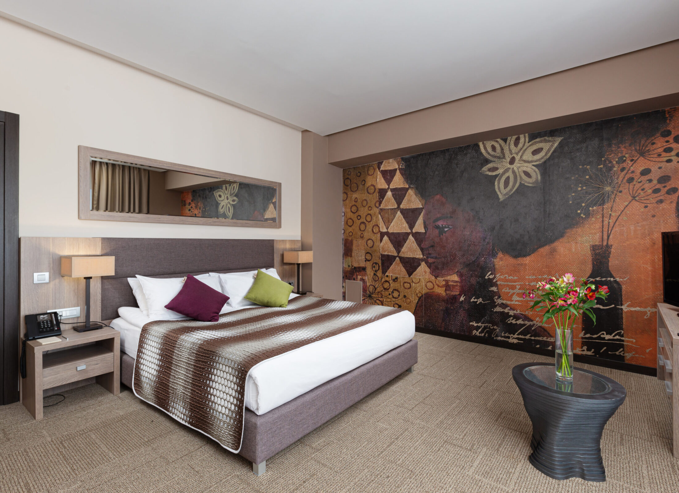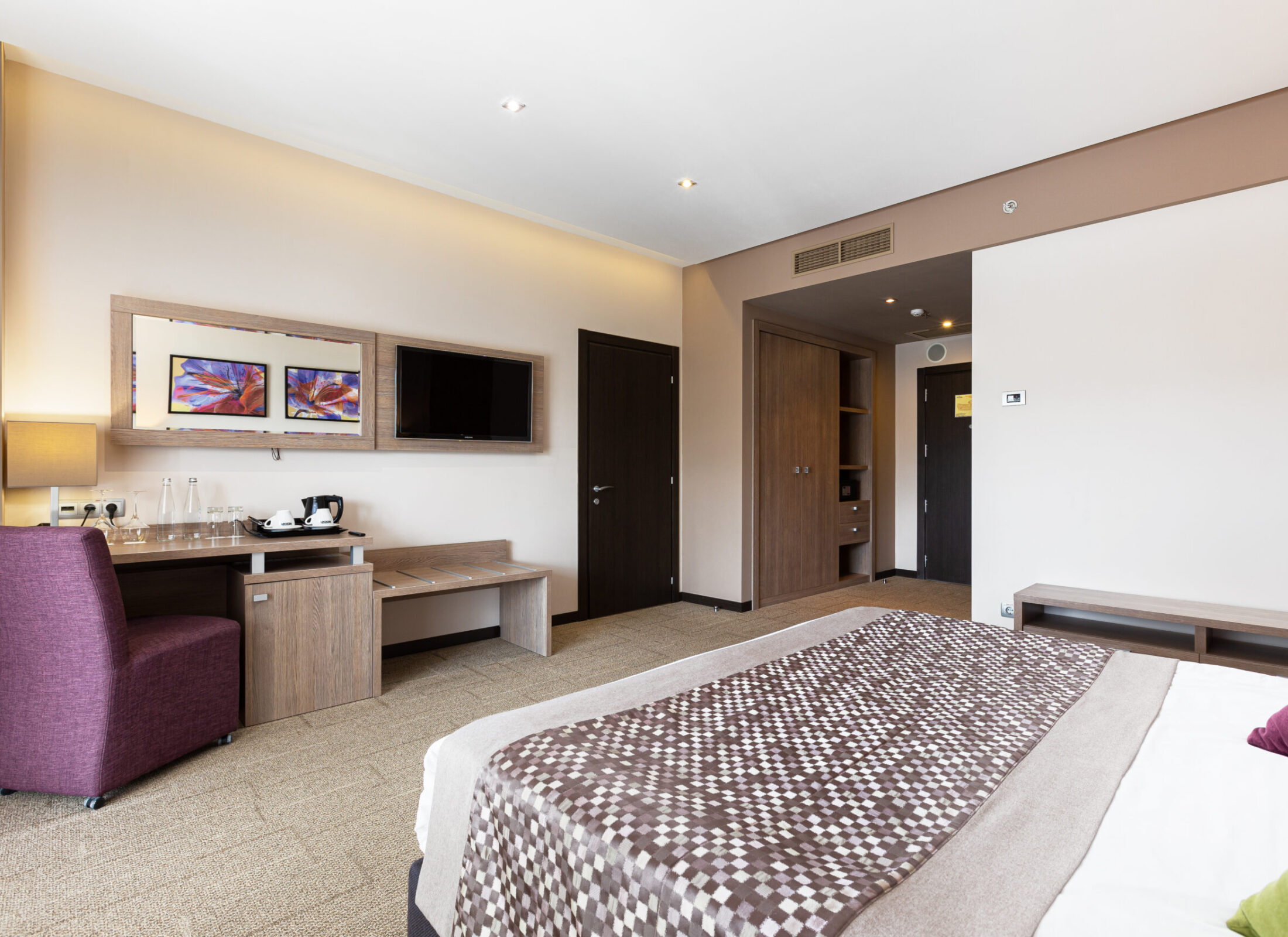 Номер Люкс за площею більший за Стандарт. Окремо виділено спальню та вітальню. Наявна кавомашина. Оскільки ми турбуємось про стан здоров’я гостей, номер є безпечним для алергіків. До ваших послуг чищення взуття та ексклюзивна доглядова косметика.