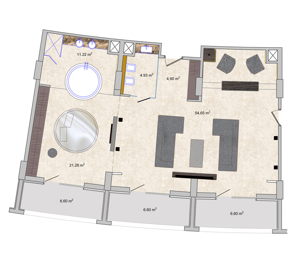 • Дві ванні кімнати (ванна, душ, джакузі, біде, дзеркало, дзеркало для макіяжу, збільшувальне дзеркало, капці, засоби гігієни, фен, халат)